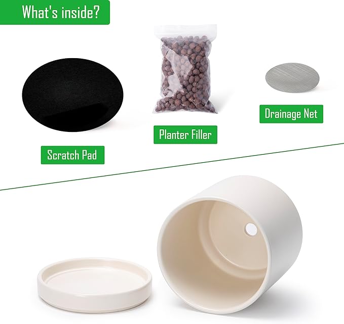 - Planter pot with drainage hole, mesh drainage net and protective scratch pad included.