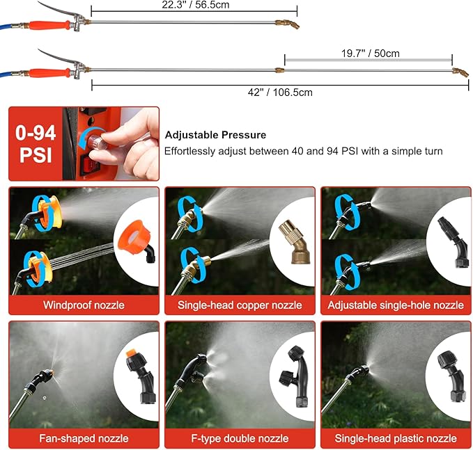 - Multiple Nozzles Available: Our battery powered sprayer comes with 6 nozzles and 1 wands, giving you more options to choose how you spray! The metal wand features an length of 29.5", and the plastic wand is suitable for bleaching agents and other corrosive liquids. The water pressure can be easily adjusted from 0 to 94 psi via the knob. Our sprayer will meet your various spraying needs with no trouble.
