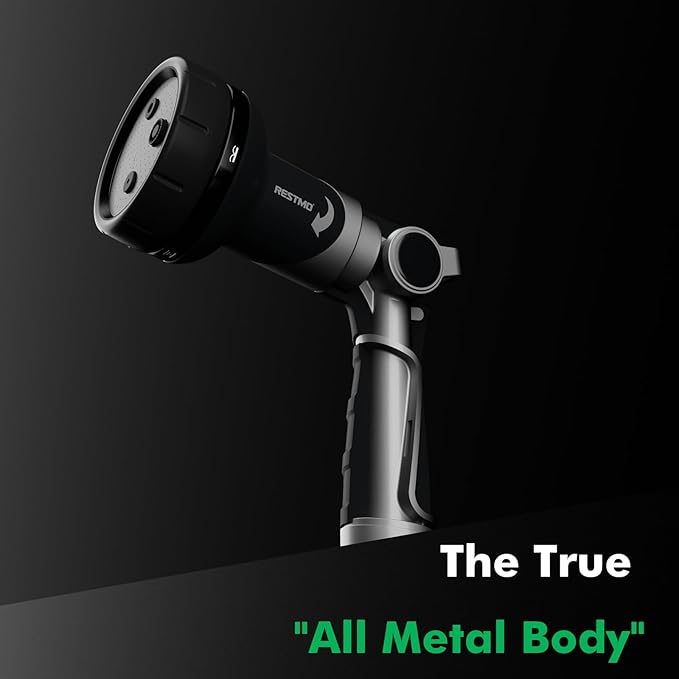 - HEAVY-DUTY GARDEN HOSE NOZZLE: The nozzle gun body is constructed with zinc-alloy material, solid & robust to resist rust, corrosion and wear. The shock resistant rubberized bezel dial can enhance durability & flexibility and withstand hard impacts & heavy force in daily drops and shocks. It is much stronger, more durable and long-lasting than plastic water nozzles.