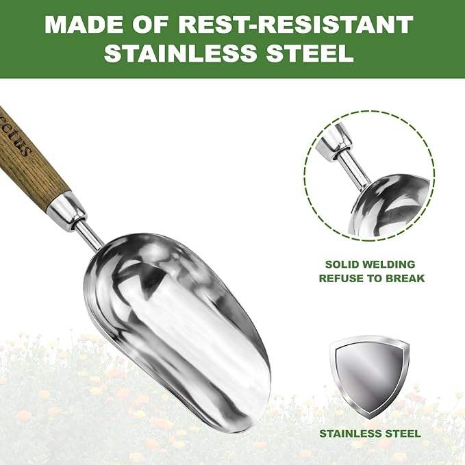 - 【High-Quality Metal Resists Bending】The gardening scoop is made of nice stainless steel, which has firm compression and corrosion resistance and is more sturdy and durable, which means it doesn't bend or break when you scoop loose soil or compost around new plants. Worked well for filling pockets in a vertical planter with soil.
