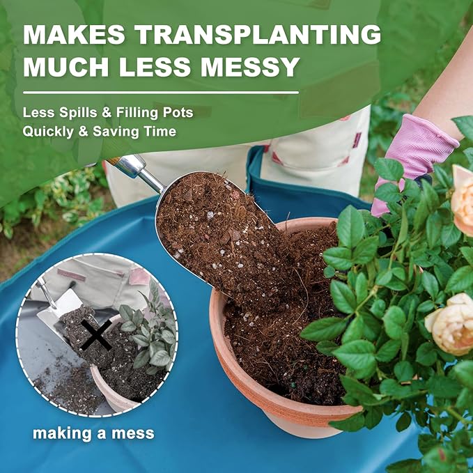 - 【Works Much Better Than Trowel】Regular trowels are not good for replanting or potting plants. They always lose soil on the way from the bag to the pot. This potting scoop is deeper and holds the soil much better so you don't spill it all over the place. It is a very necessary tool for repotting and for scooping dirt out of bags.