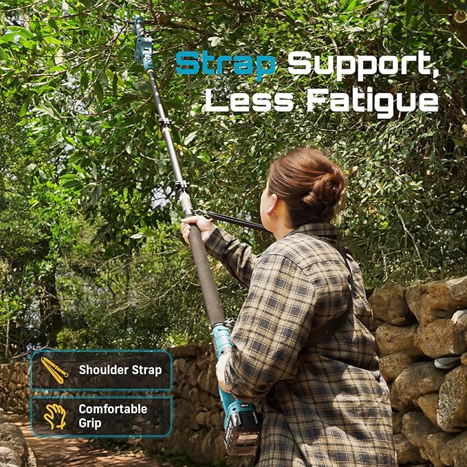 - Comfort in Every Cut: The cordless pruning shears with pole are lightweight and fitted with a padded shoulder strap; It reduces pressure on your arms and shoulders, helping you move easily through trees and garden paths, pruning longer without fatigue