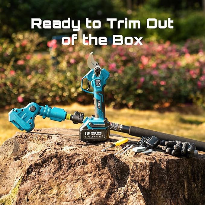 - Safety Protection: The battery powered pole pruning shears for gardening put safety first with a secure safety lock and non-slip handle to avoid accidental activation; Confidently prune in any condition, even in damp weather or while wearing gloves