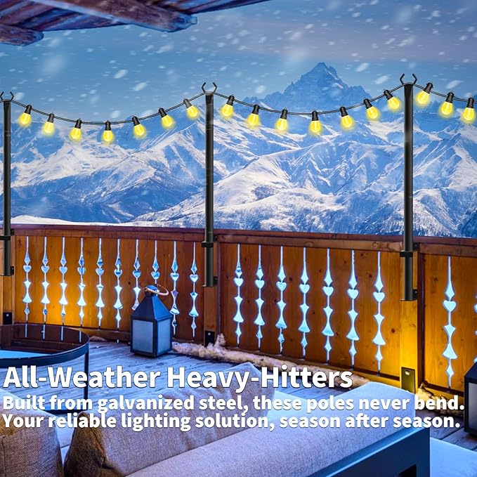 - Heavy-Duty Steel, All-Weather Pro. Made from tough galvanized steel, our outdoor string light poles are built to endure. They won’t bend, whether on your patio or a commercial site. The waterproof, rust-proof coating keeps them strong and looking great, season after season. Engineered for stability, they’ll stand firm through any storm—your go-to for reliable lighting.