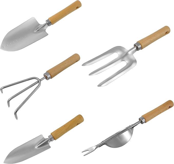 - 🌻DURABLE, HIGH-QUALITY HAND TOOLS – This set includes a hand trowel, transplanter, rake, fork, and weeder, all made from premium rust-resistant metal with ergonomic anti-slip handles to maximize comfort and durability.