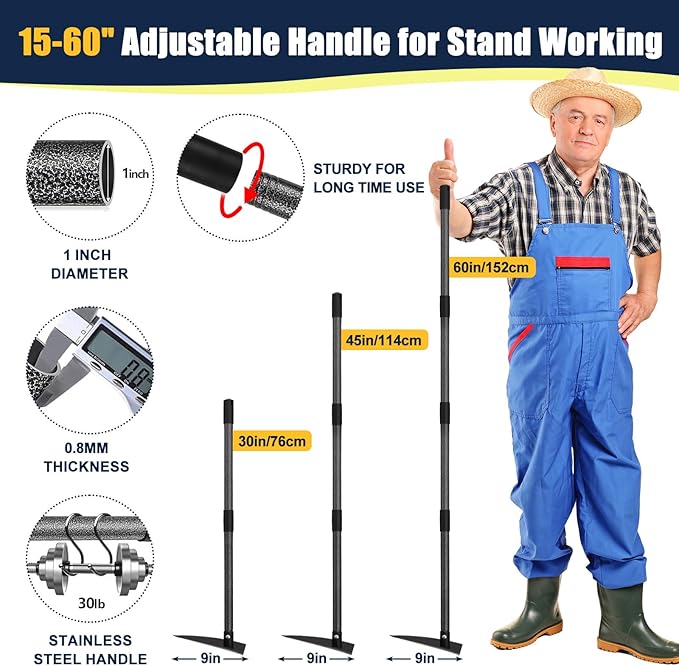 Extra-Sharp Triangular Hoe - Heavy Duty Gardening & Construction Tool with 15"-60" Adjustable Stainless Steel Pole, Detachable Design for Digging, Weeding, Trenching