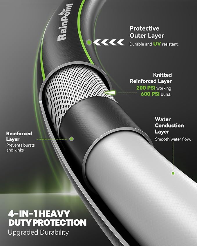 - 【Durable 4-Layer Design】Designed for extreme conditions, garden hose 5 ft handles tough winter conditions with 600 PSI burst strength. No more worries about cracks or bursts even in freezing temperatures
