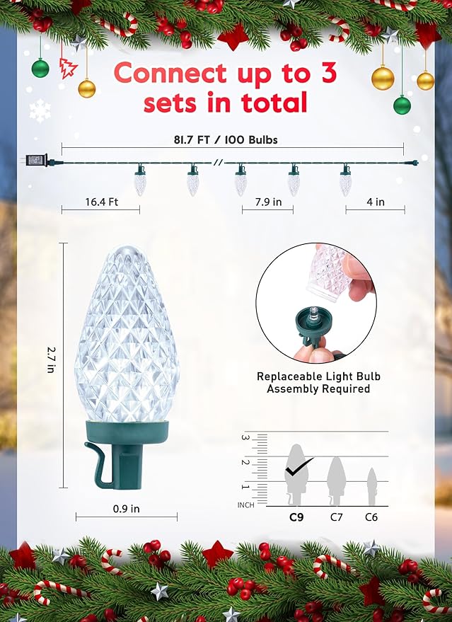 - 3 Sets Connectable: Hang or place these C9 Christmas tree lights effortlessly, connect up to 3 sets for a total of 245 feet (300LED). C9 bulbs are removable and replaceable, and if one burns out, the others stay lit. Ideal for decorating roofs, patios, and gardens, creating an inviting atmosphere
