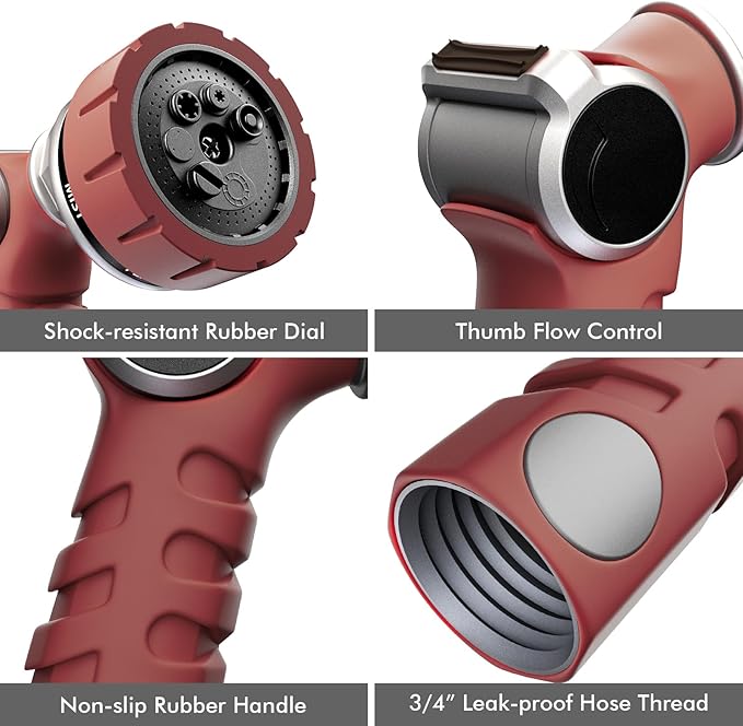 - HEAVY-DUTY GARDEN HOSE NOZZLE: The nozzle gun body is constructed with zinc-alloy material, solid & robust to resist rust, corrosion and wear. The shock resistant rubberized bezel dial can enhance durability & flexibility and withstand hard impacts & heavy force in daily drops and shocks. It is much stronger, more durable and long-lasting than plastic water nozzles.
