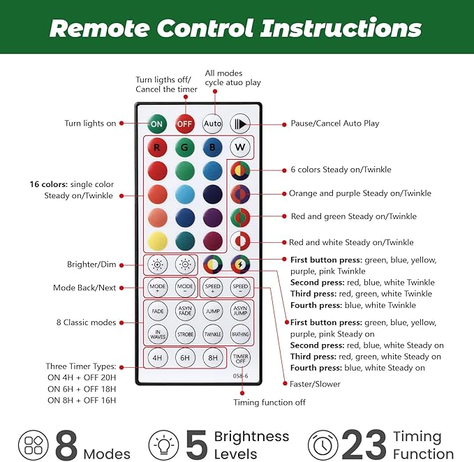 - đăPre-lit Lights with RemoteăThere are 4 brightness levels and up to 90 lighting modes with various color changes. You can choose different lighting modes by remote control to get your desired atmosphere.