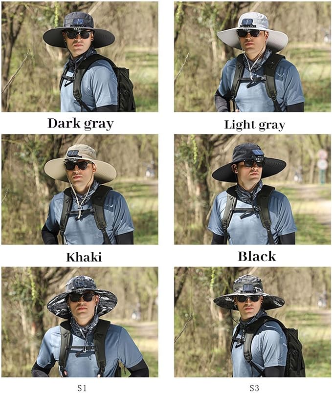 • Wide Brim Hat with Fan: sombrero con ventilator solar, You will get 1 x wide brim sun hat, which is built-in 2 x solar fans, and 2 x USB cables. You can hang the outdoor fishing sun cap around your head and take it everywhere