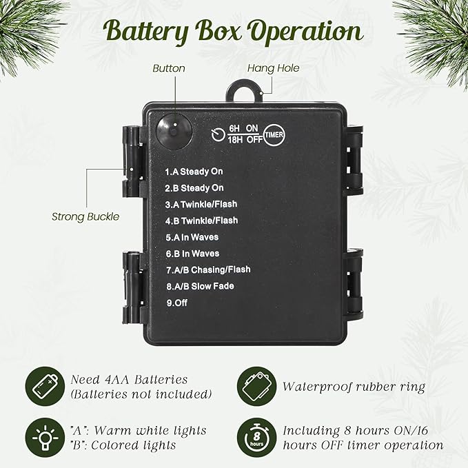 - šćTimer Function & Battery OperatedćThe timer function allows you to set an automatic cycle of 6 hours on and 18 hours off. With a fully waterproof battery box, it only requires 4 AA batteries to provide lighting for an entire season.