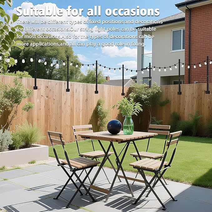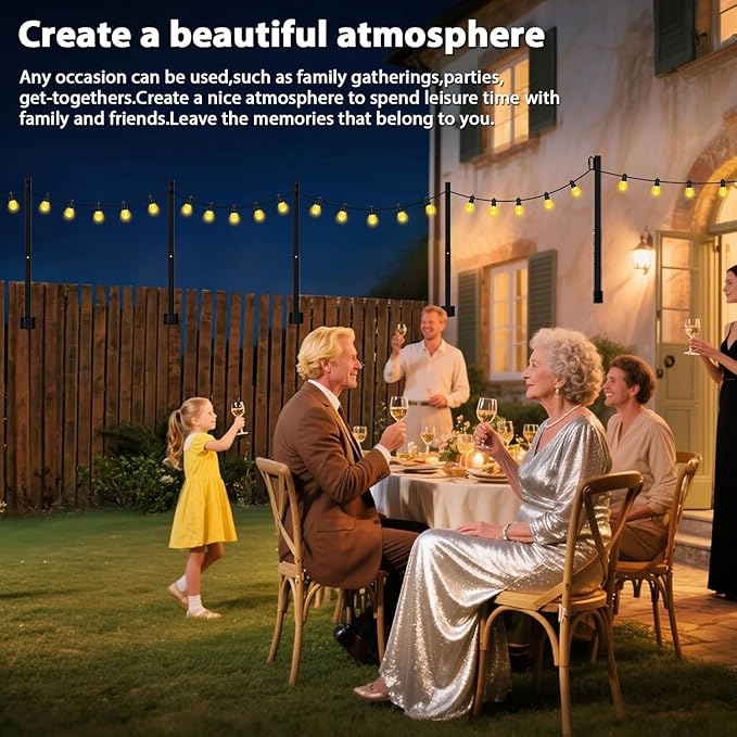 - STURDY AND DURABLE: outdoor string light poles are made of high quality materials that can withstand all kinds of wind and rain to ensure durability. The sturdy construction ensures stability, even in windy conditions. Rest assured that your lights will stay firmly in place, allowing you to enjoy your outdoor lighting worry-free.