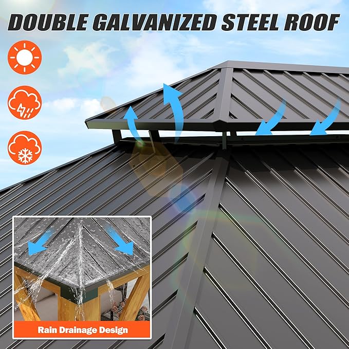 - Durable Galvanized Steel Roof: Anti rust and fade resistant steel roof can protect you from rain, snow, or scorching sun, so you can easily cope with rain and snow. We also offer convenient storage racks that provide additional workspace, perfect for storing wine glasses, tea cups, etc., enhancing the outdoor experience.