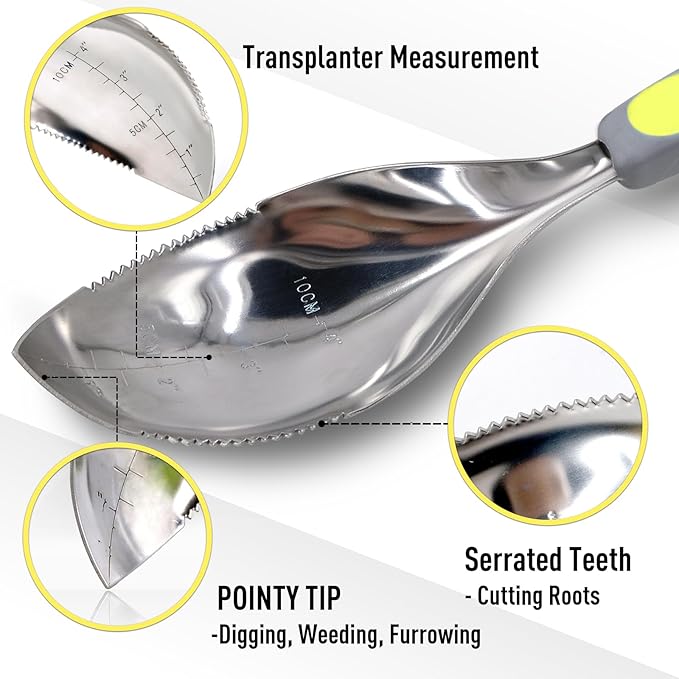 - Sharp Serrated Edge for Cutting Roots – Effortlessly slices through tough roots and compacted soil, making gardening faster and easier. Etched measurement makes proper planting depth and the sharp serrated edges easily cut through roots and vines