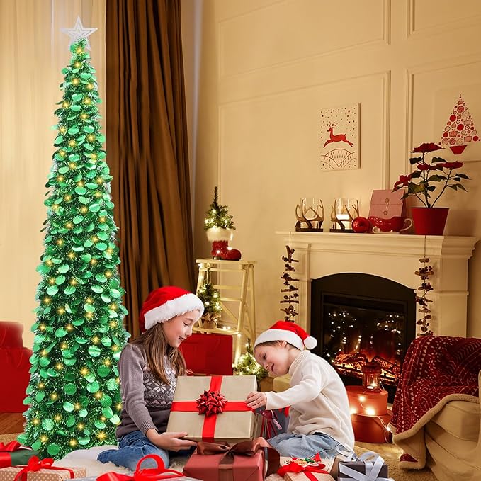 - 6 FT POP UP TINSEL CHRISTMAS TREE WITH LIGHTS: HMASYO artificial slim Christmas tree is loaded with shimmering circular sequins around and warm white lights. Tinsel tree branches reflect light creating a sparkling holiday decoration, shiny and sparkling, adding happiness and Christmas magic to you home, this magic Christmas tree is an eye-catching addition to your room decoration during the holidays