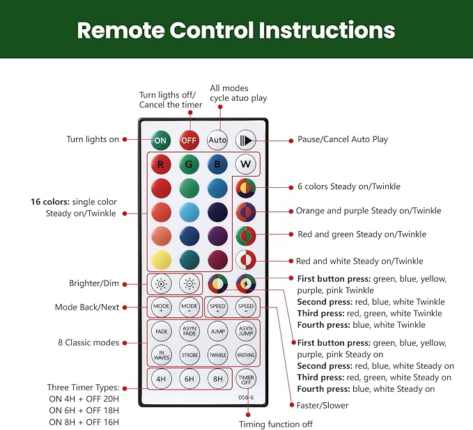 - đăRemote Control FunctionăYou can use the remote control to freely and easily remotely adjust a variety of lighting modes+light brightness+speed+ timing types. (Includes remote control and battery for remote control)