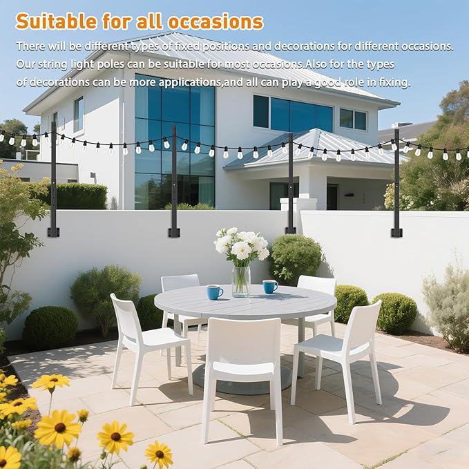 - Efficient and excellent use:Outdoor string light poles does not take up floor space during use. There will be no impact on the original backyard or deck design with the efficient use of space. And the effect of hanging up, you can make the light effect of the string of lights better. At the same time, because of its own small size, disassembly and storage is also very fast.