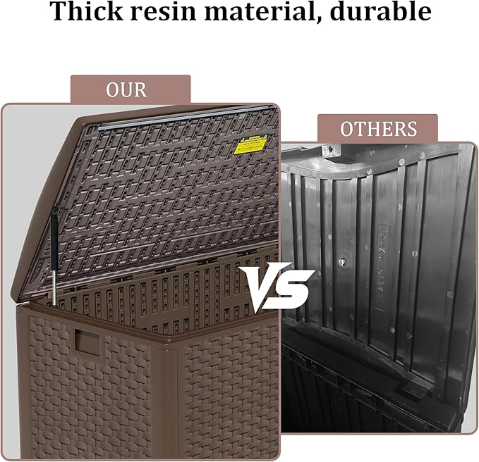 - Upgraded Outdoor Storage Box Waterproof. Blow-molded panels provide thicker, more durable construction for long-term outdoor use, suitable for storing patio cushions, gardening tools, and pool accessories.