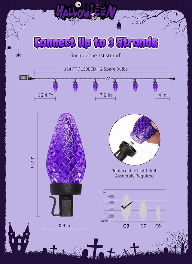 - 🎃 Super Long C9 LED Halloween Purple Lights: Get spooky with 114FT of glowing purple C9 lights! Featuring 150 vivid LED bulbs plus 2 spare bulbs, these oversized faceted lights bring eerie charm to your outdoor Halloween decorations. With 8-inch spacing and a generous 16.4FT lead wire, they’re perfect for wrapping porches, rooflines, fences, or trees