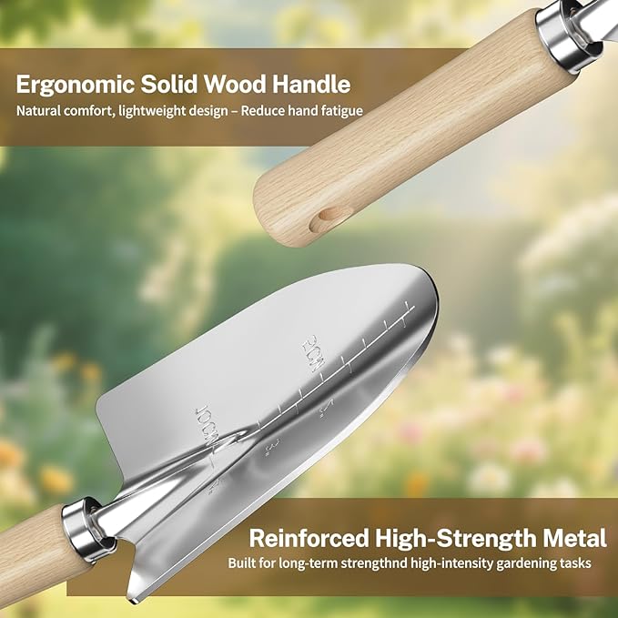 - 【Plant with Precision and Confidence】The shovel blades feature clear depth markings, guiding you to plant or transplant seedlings at the perfect depth every time. Whether you're a beginner taking your first steps in gardening or an experienced green thumb, these precise markings ensure your plants get the optimal start.
