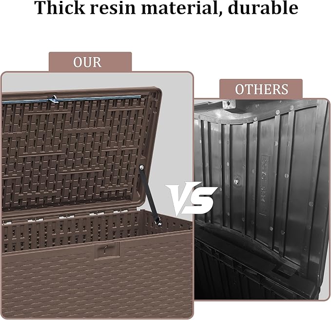 - Upgraded Outdoor Storage Box Waterproof. Blow-molded panels provide thicker, more durable construction for long-term outdoor use, suitable for storing patio cushions, gardening tools, and pool accessories.
