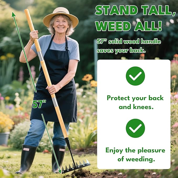 - Upgraded Iron Weeding Rake 2.0: Tackle stubborn roots effortlessly with our 8-tooth iron weeding rake. Simply plunge the multi-jawed head deep into soil to grip weeds at the root source. The ultimate multi-purpose weed puller tool for year-round farm, garden, and lawn tasks – especially tackling dry, hard soil in expansive yards. Total rake length 57 inches(Includes 10" rake + 47" Long Handle).