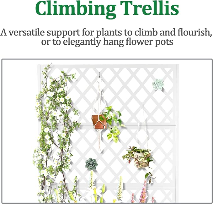 - Space-Saving Design: The planter box is combined with the trellis to provide a space-saving and aesthetically pleasing gardening solution. The vertical design of the trellis maximizes the planting area while maintaining a compact footprint. The outdoor raised garden bed’s vertical design is ideal for people with limited space to build a beautiful garden on a terrace or in a small yard.