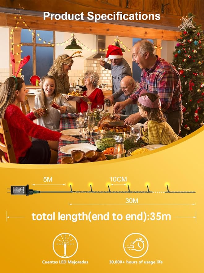 - 【Merry Christmas!】The outdoor Christmas lights are 16.4ft of wire length, with a 98.4ft string lights, totaling 115ft. The bulb spacing is 0.33ft. It uses 300 high-quality LEDs, creating a charming lighting effect. The green wire makes the twinkle lights look more natural. After Christmas, you can leave them up all year round anywhere. They are perfect for decorating the garden, porch, patio, or balcony, renewing every corner of your home.