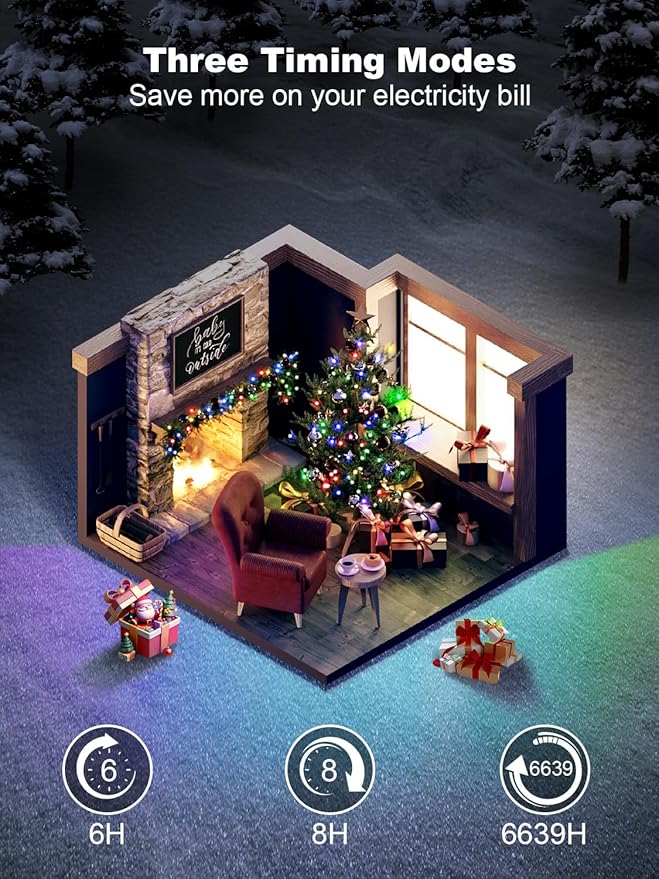 - 【Timer and Memory】There are three available timer modes: 6H, 8H, and 6639H. When the Christmas lights enter timer mode, a green light on the power supply turns on. Otherwise, the timer mode is off. It also has a memory function that saves the last set lighting mode, so when you turn the lights off and on again, you won't need to reset the lighting mode.