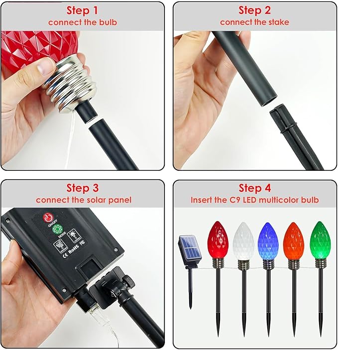 - [C9 LED outdoor Christmas lights]: Our C9 Christmas Decorations are 8.5ft in height, total 2 strings with 10pcs of strawberry bulbs and 10pcs of sturdy stakes. Each bulb is in larger size 2.8"*5.9" compared with other small size 1.1*2.9" , Christmas colored bulbs with diamonds surface with twinkle effects, the solar Christmas Path lights outdoor are perfect for your trails, garden, patio and yard decor.