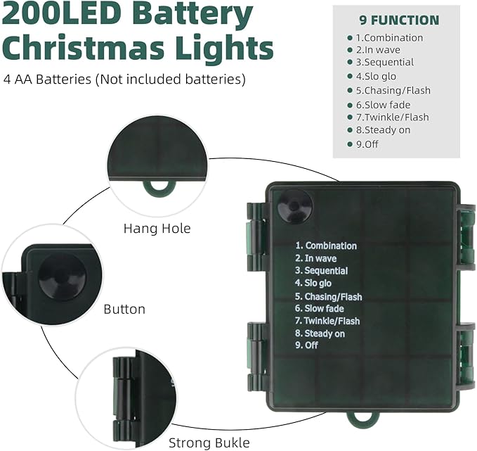 - Christmas light with 8 modes & Memory Function: Press the button on the battery box to select the mode from 8 options: Combination, In wave, Sequential, Slo glo, Chasing/Flash, Slow fade, Twinkle/Flash, Steady on. Timer and Memory function will be activated as you turn the string lights on, no more operation needed.