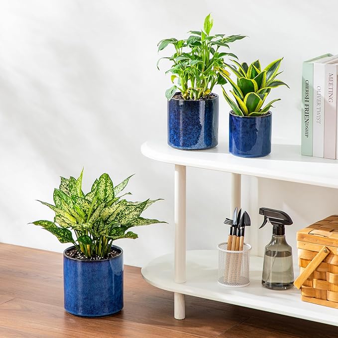 vancasso Ceramic Plant Pots, 4.25+5.25+6.25 Inch Planter Pot with Drainage Hole, Flower Pots for Indoor Outdoor Plants, Set of 3, Blue