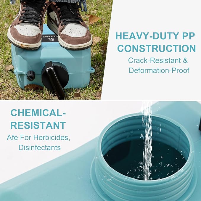 - Durable & Leak-Proof: Crafted from heavy-duty HDPE and ABS materials, this lawn sprayer stands up to drops, weather, and harsh chemicals. The integrated filter prevents clogs by blocking debris, while leak-proof seals at every connection ensure mess-free use. A wide mouth simplifies filling and cleaning, and clear measurement markings on the tank let you track fluid levels instantly.