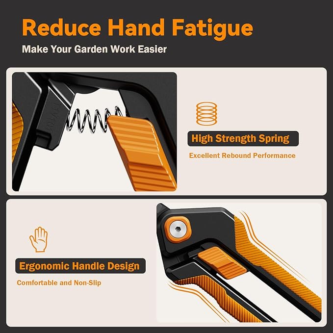 - 【Effortless Cuts Every Time】Equipped with a high-tension spring for reduced effort and ergonomic handles, these garden clippers offer a comfortable grip and reduce hand fatigue during extended use. This makes them ideal for a wide range of gardening tasks