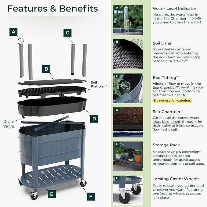 - PATENTED TECHNOLOGY: The Soil Platform elevates and supports the soil above the Eco-Chamber, ensuring it never comes into contact with standing water, eliminating soggy soil and promoting healthier roots. To keep everything in place, the included Soil Fabric rests on the platform, preventing soil from falling into the chamber below.
