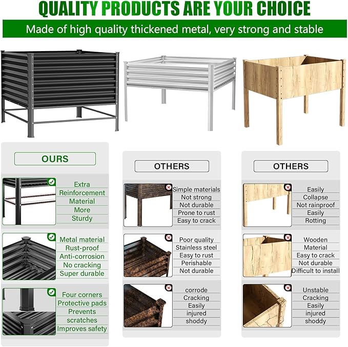 - 【Spacious Planting Space】-Our raised garden bed with legs measures 48x48x37 inches, 240 gallons, 1200LB capacity.To enhance safety and prevent any potential discomfort, we've added protective pads to the four corners both above and below the raised garden bed. These pads not only effectively safeguard against sharp corners that may poke individuals but also provide protection for your floors by preventing scratches.