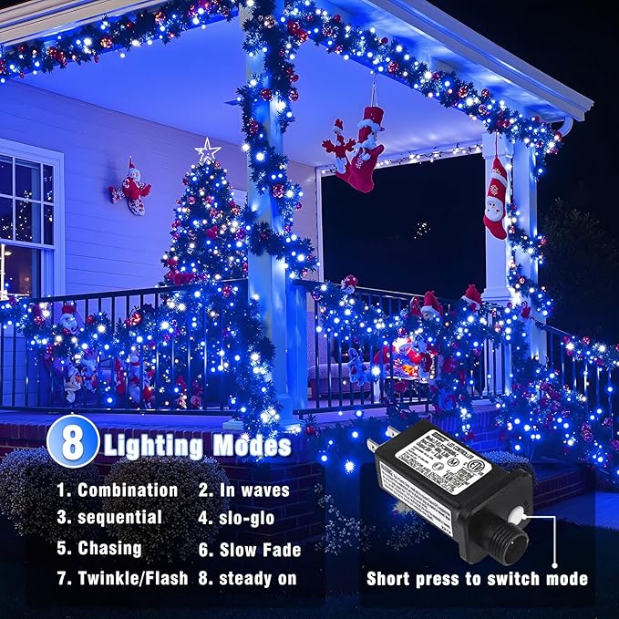 - 8 Lighting Modes: Our string lights for outside offer 8 lighting modes: combination, in waves, sequential, slo-glo, chasing/flash, slow fade, twinkle/flash, and steady on. You can switch to your favorite mode by pressing the button on the plug to create a different atmosphere for your home.