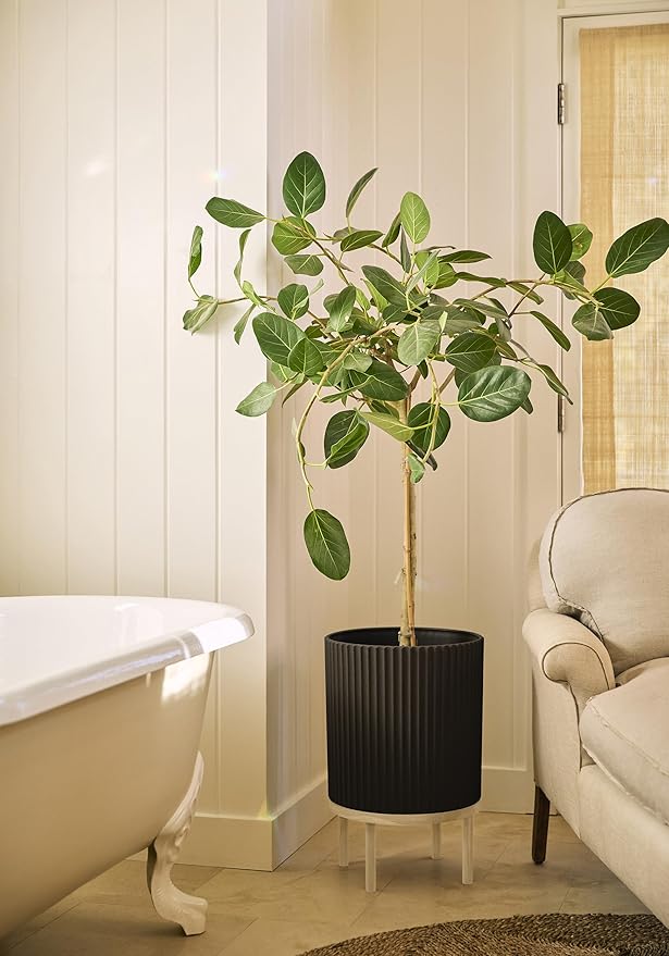 Veradek Demi Series Round Planter w/Stand for Porch/Patio | Durable Plastic-Stone Composite & Wooden Stand | Modern Décor for Tall Plants, Flowers
