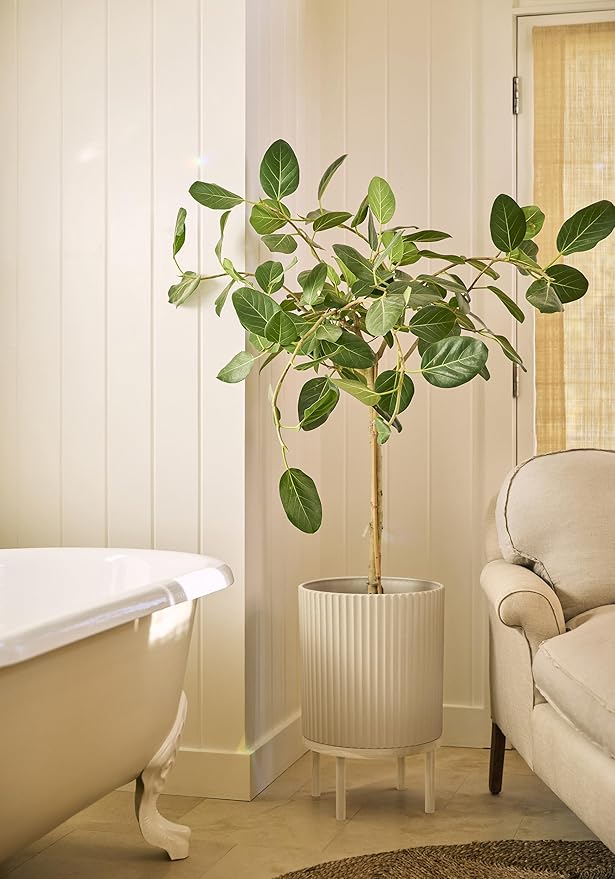 Veradek Demi Series Round Planter w/Stand for Porch/Patio | Durable Plastic-Stone Composite & Wooden Stand | Modern Décor for Tall Plants, Flowers