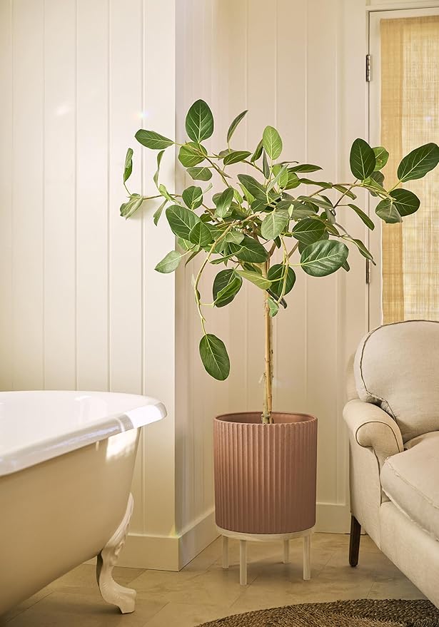Veradek Demi Series Round Planter w/Stand for Porch/Patio | Durable Plastic-Stone Composite & Wooden Stand | Modern Décor for Tall Plants, Flowers