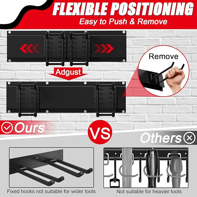 - 32-inch Adjustable Garage Wall Tool Rack: Measuring 32 inches in length, this wall-mounted organizer comes with 6 flexible hooks (2 tool hooks, 2 double-layer hooks, 2 single hooks) and 2 sliding rails. The hooks glide smoothly along the rails, letting you rearrange them in seconds to fit tools of all sizes. Maximize vertical space and save floor space.