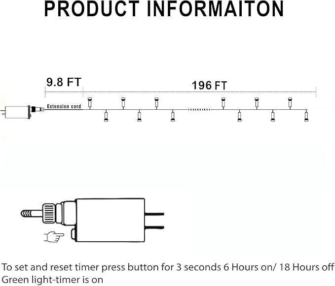 - Light Specifications: Each Christmas string light features 600 LED lights, with a total length of 206 ft. The section of the wire that has LED bulbs is 196 ft long, while the lead cord without lights measures 10 ft. The spacing between each LED bulb is 3.9 inches. Please note that these LED string lights cannot be extended or connected together
