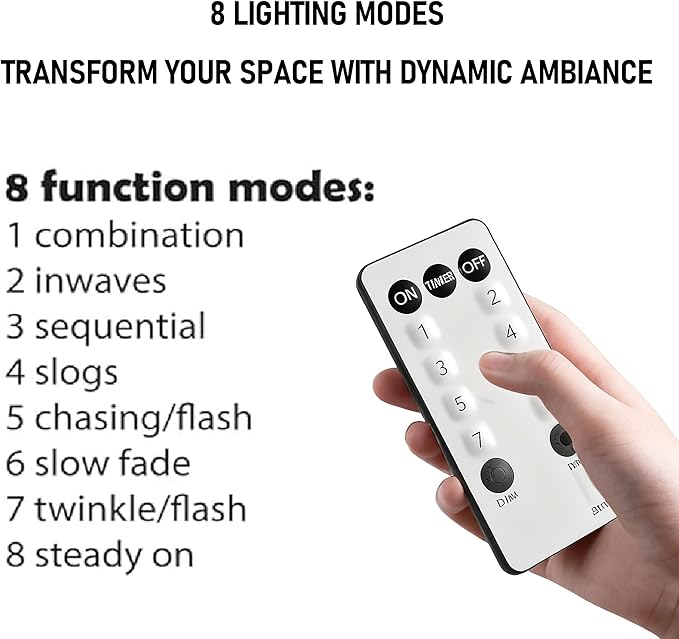 - Remote Control: The string lights come with a remote control that offers 8 modes: combination, in waves, sequential, slo-glo, chasing/flash, slow fade, twinkle/flash, and steady on. The brightness can be adjusted by pressing the "DIM" button. Additionally, it features a timer mode of 6 hours on/18 hours off, by pressing the "TIMER" button or long pressing the round button on the adapter until the green lights illuminate