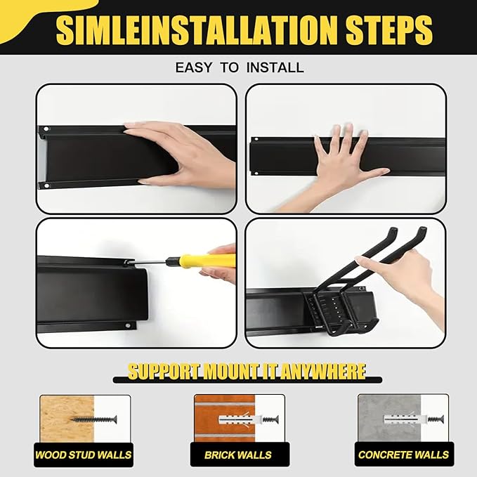 - 【Multifunctional】 Garage racks for storage can be installed in garages to hang garden tools and folding chairs; they can be installed in gyms to store dumbbells and yoga mats; they can be installed in repair rooms to hang wrenches, chainsaws, and other equipment; they can be installed on balconies or in bedrooms to hang everyday cleaning tools.