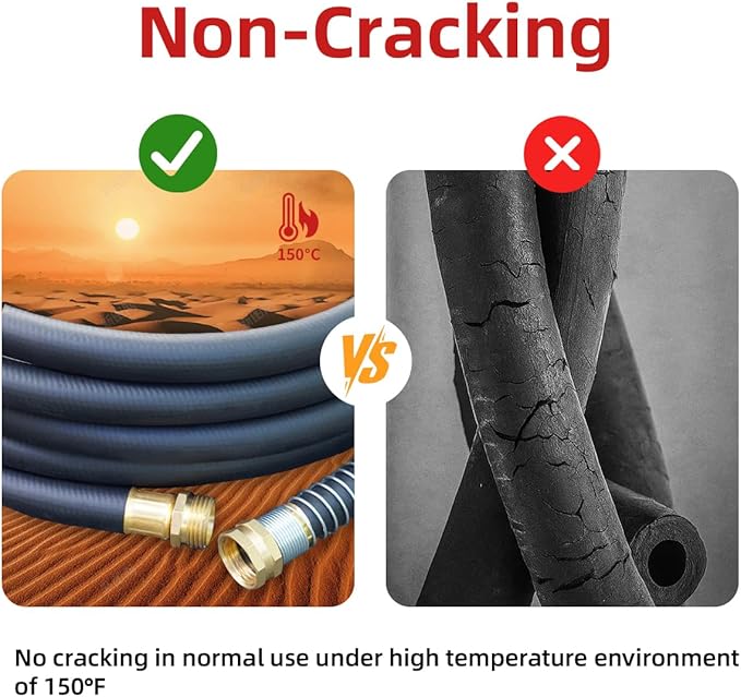 - All Weather Applicable: Designed for hot and cold water, this heavy duty hose can remain flexible in extremely low temperatures as low as -40℉, and will not deform or age in high temperature environments. Our rubber water hose is easy to coil and unwind.