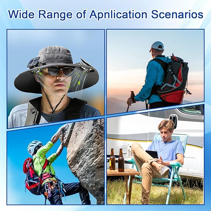 - 【Versatile Design】: This Fan Hat for Men is perfect for your everyday activities and a variety of outdoor adventures. It's suitable for activities such as mountaineering, gardening, golfing, farming, cycling, and traveling. Stay cool, protected, and comfortable all summer long with our Solar Hat.