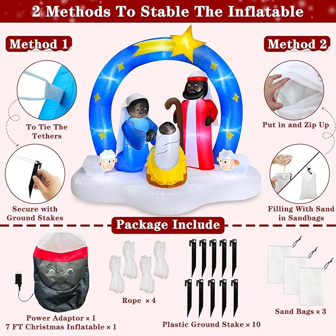 - Durable for Outdoor Use: Crafted from waterproof, tear-resistant polyester, this inflatable withstands rain, wind, and cold. Includes 10 stakes, 3 sandbags, and 4 tethers for secure setup, ensuring it stays stable in any weather. A reliable nativity inflatable outdoor built to last through seasons.