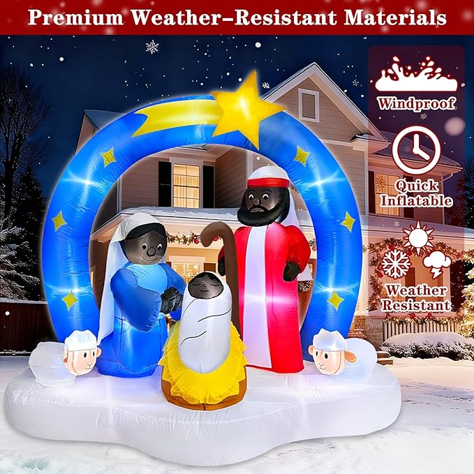 - Christmas inflatable Black Nativity Scene: This 6ft×7ft inflatable features a starry arch with a leaning Black angel, capturing the essence of the nativity story, it stands out as a heartfelt black Christmas inflatables. Perfect for adding inclusive cheer to your holiday display.