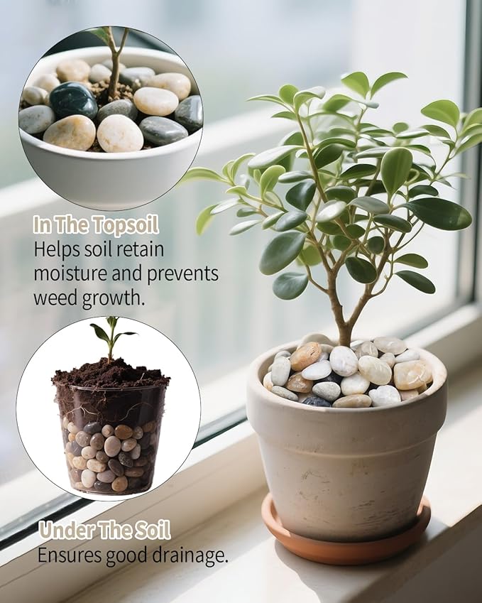 - 6 LB Natural Polished River Rocks (5/16"-5/8"):Includes approx 300 smooth, rounded stones perfect for decorative landscaping, plant pots, and DIY projects. Uniform size ensures consistent coverage for gardens, walkways, and indoor decor